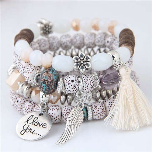 $2.69 Select options This product has multiple variants. The options may be chosen on the product pageAlloy Wing and Cotton Threads Tassel Love Fashion Four Layers Women Beads Costume Bracelets – White