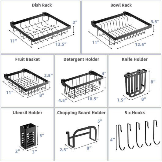 - ● 4 baskets chopping board and utensil and knife holder and 5 hooks meet your storage needs