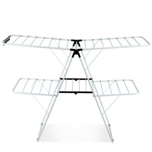 The fully assembled rack is easy to use. Adjustable wings and ample drying space enable you to hang longer clothes or bed linen with convenience. Besides triangle structure makes it not easy to collapse and deform. This rack made of durable steel is suitable for both indoor and outdoor use. You can use it as a storage rack in your bedroom or living room. The drying rack can also be used to dry quilts pillows and shoes in your balcony backyard and other places. Apart from that you can fold it after usage and store it anywhere.