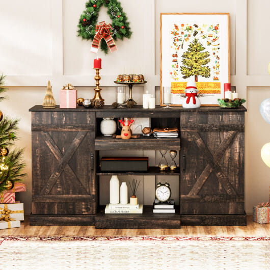 ● Rustic TV stand with wood grain finish and LED lights