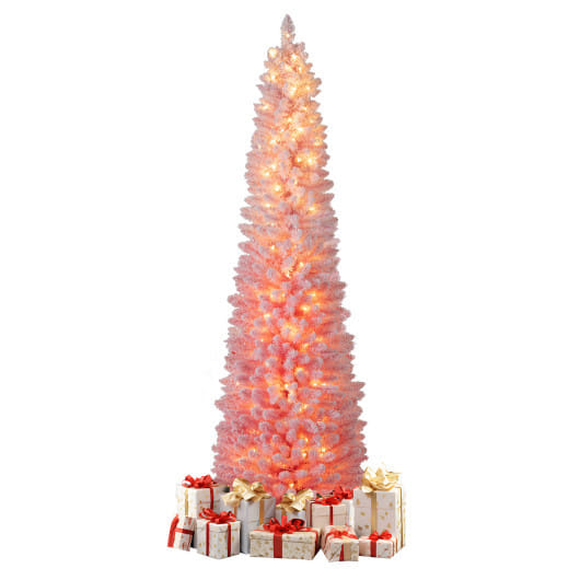 7 FTSnow-flocked Artificial Pink Christmas Tree Pre-lit Hinged Xmas Tree for Holiday Decoration
