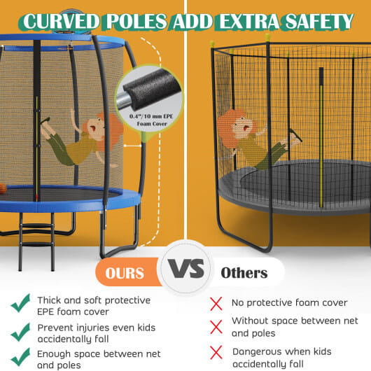 With high density enclosure net safety pad and safety buckles parents will be relieved while their kids are jumping. More importantly these net poles are designed to be curved which leaves ample space between the poles and net and prevents kids from injuries when they fall down. The high-quality and durable jumping mat and heavy-duty springs offer unmatched jumping experience. And the basketball hoop also provides more fun while jumping. Moreover made of galvanized steel frame and U-shaped legs with paint coating this outdoor trampoline features longer service life than other normal trampolines. In addition the installation is easy with instructions and accessories.