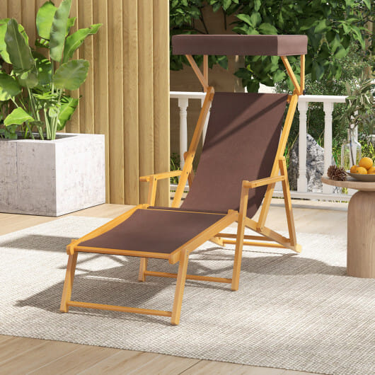 Birch Wood Chaise Lounge Chair Foldable Beach Chair with Adjustable Canopy-Brown