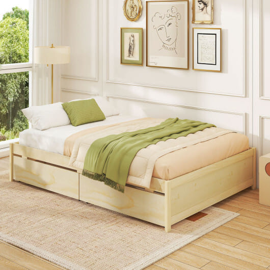 Full Size Wooden Bed Frame with 2 Rolling Storage Drawers-Natural