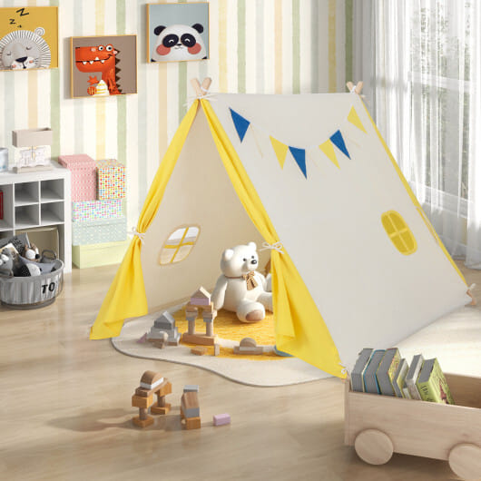 ● The enchanting kids play tent with cute windows and hanging flags attracts kids’ attention