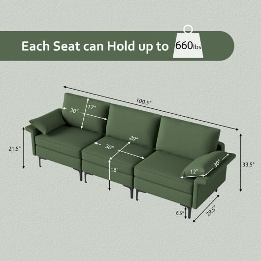 This sofa couch provides the most needed comfort with high-density sponge cushions and the original distributed spring system. You can feel the softness and warmth of the linen fabric which is also breathable with fabric absorption. This sofa couch is supported by metal legs with non-slip foot pads to ensure an enlarged weight capacity. It has a spacious room where you can stretch your body and lie down. This 3-seat modern sofa couch ships in 3 packages.