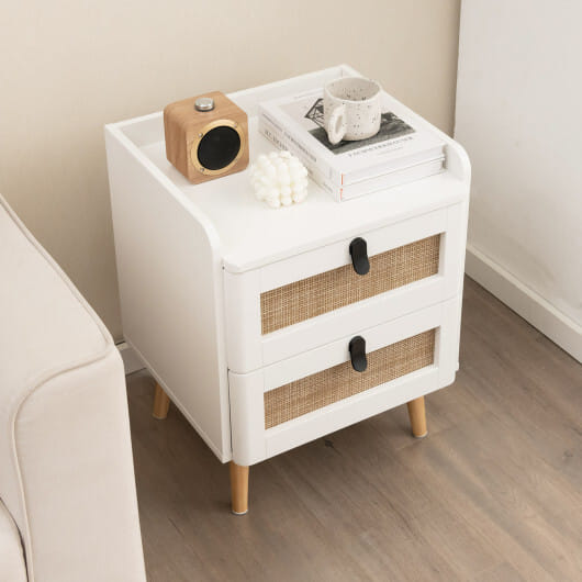 Modern End Table Bedside Table with 2 Rattan Decorated Drawers-White