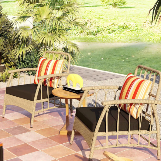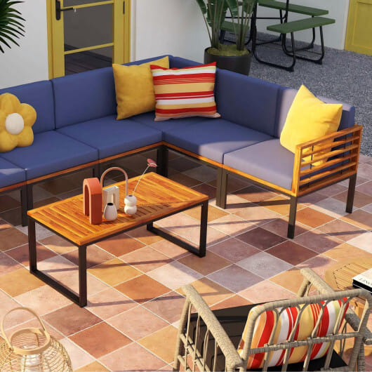 This outdoor furniture set blends warm wood tones with a modern minimalist metal frame creating a cozy yet stylish ambiance. You can pair the deep blue cushions with bright color pillows (not included) add vibrancy and layered color to the space. The coffee table is both practical and elegant perfect for displaying decor or serving refreshments making the whole set ideal for relaxing in the garden patio or balcony.