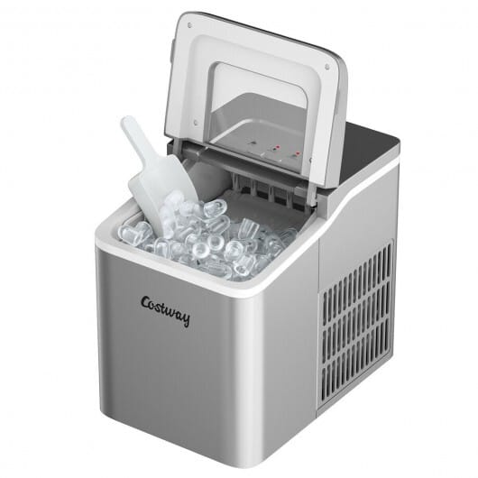 This countertop ice maker can produce 9 pcs of bullet-shaped ice in 8 minutes and up to 26 lbs ice in 24 hrs greatly satisfying your daily ice requirements. The capacity of the water tank is 1.6 liter. And the simple control panel with a self-cleaning function provides great convenience. Designed with transparent lid this portable ice maker allows you to view the progress easily. And it will not disturb you with 45 dB low noise. Featuring with portable yet compact design this premium ice maker machine with ETL certification is perfect for home office party and bar.
