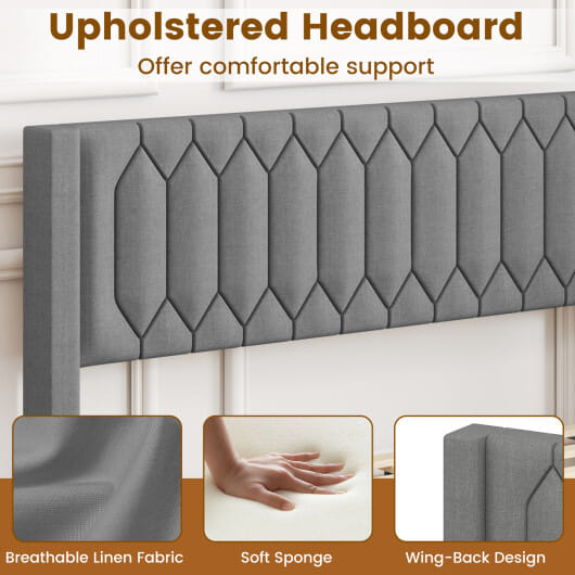 ● Upholstered headboard with wing-back design can offer comfortable support